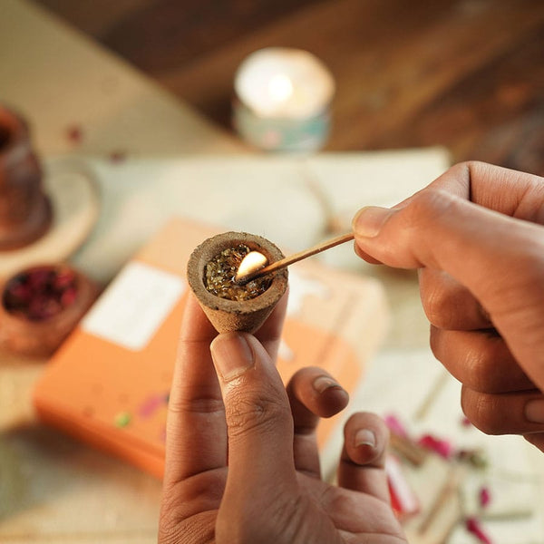 Light the Cow Aura pot on a heat-safe plate. Let the gentle smoke rise — carrying with it the purity of nature and the blessings of the Vedas.